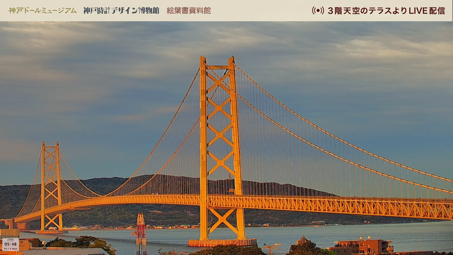 明石海峽大橋曾經是世界最長跨距的吊橋,全長約3,911公尺,中央跨距達1,991公尺,連接日本神戶和淡路島,是當地代表性地標。監視器位於神戶人偶博物館3樓,往西南方向的明石海峽大橋和淡路島拍攝。